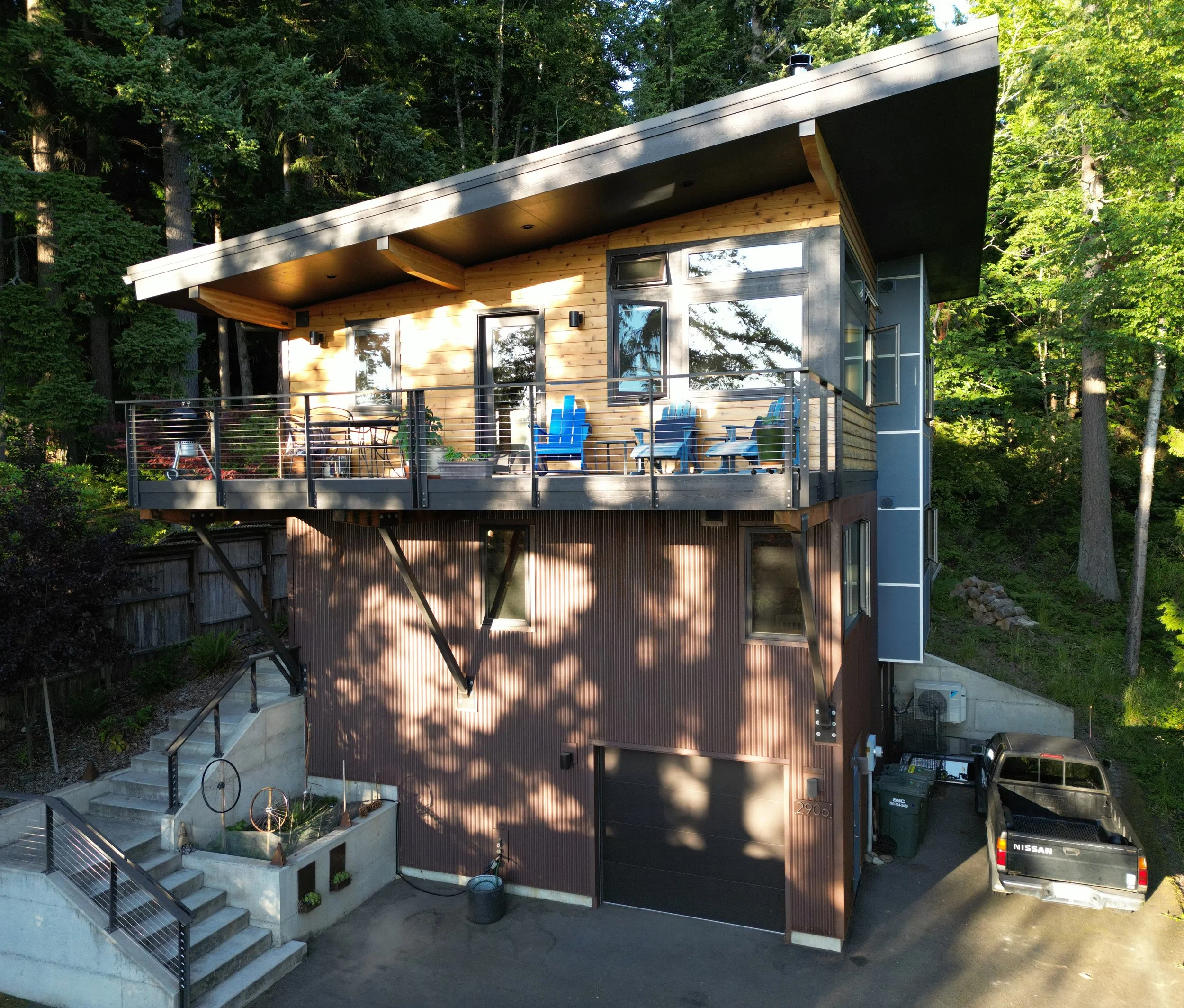 A challenging site can push a design into a unique and exciting direction. In this case, a steep slope located next to a sculpture garden was the canvas to work upon. We opted to create a 3-story structure to minimize the footprint and excavation requirements, while elevating the main living area to a high perch with a beautiful view of Lake Whatcom, the Puget Sound, and the surrounding forest canopy. Simple primary forms and creative structural solutions define the overall architecture. The finished square footage is relatively compact, but aims to be right-sized; nothing excessive, nothing too cramped.