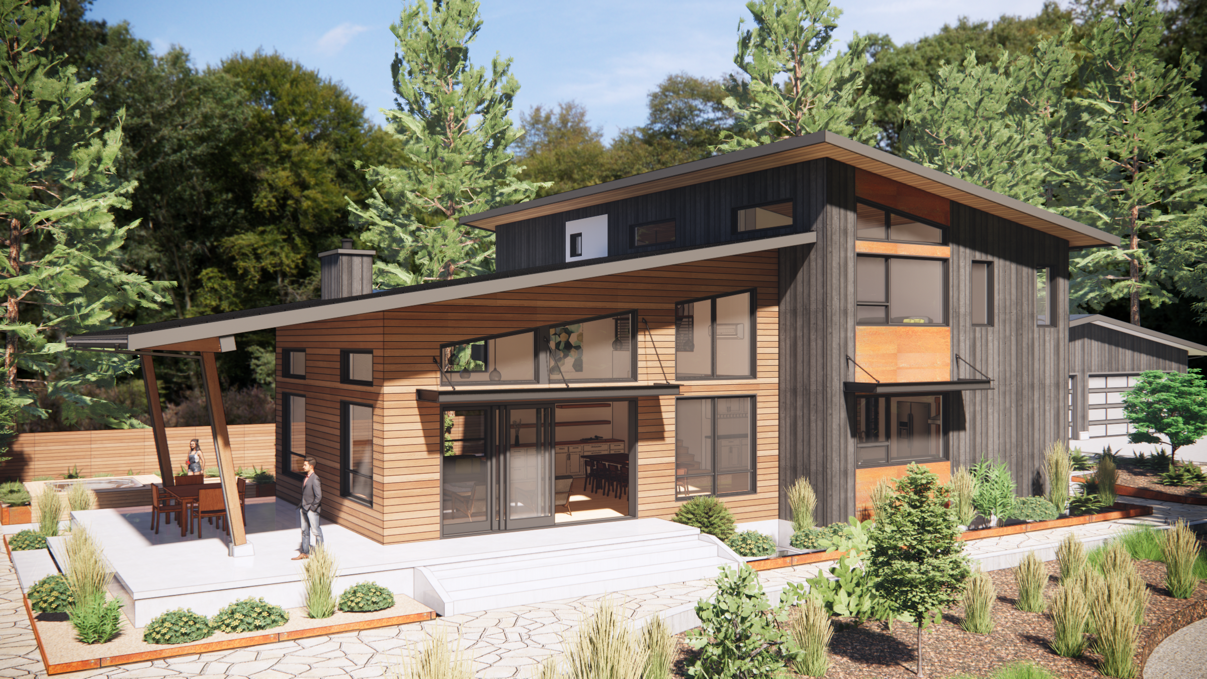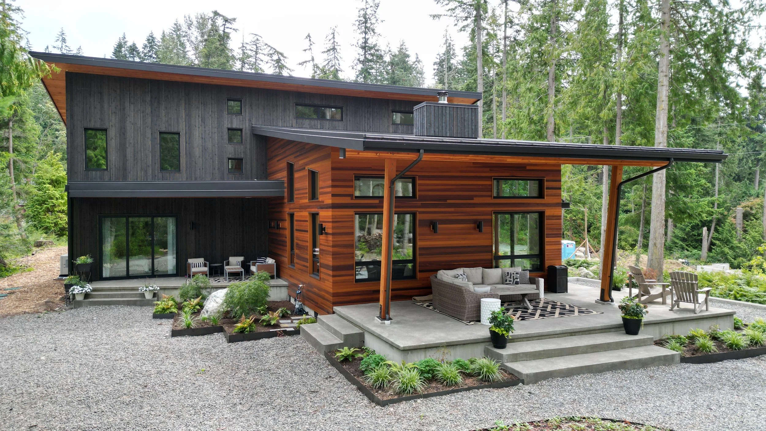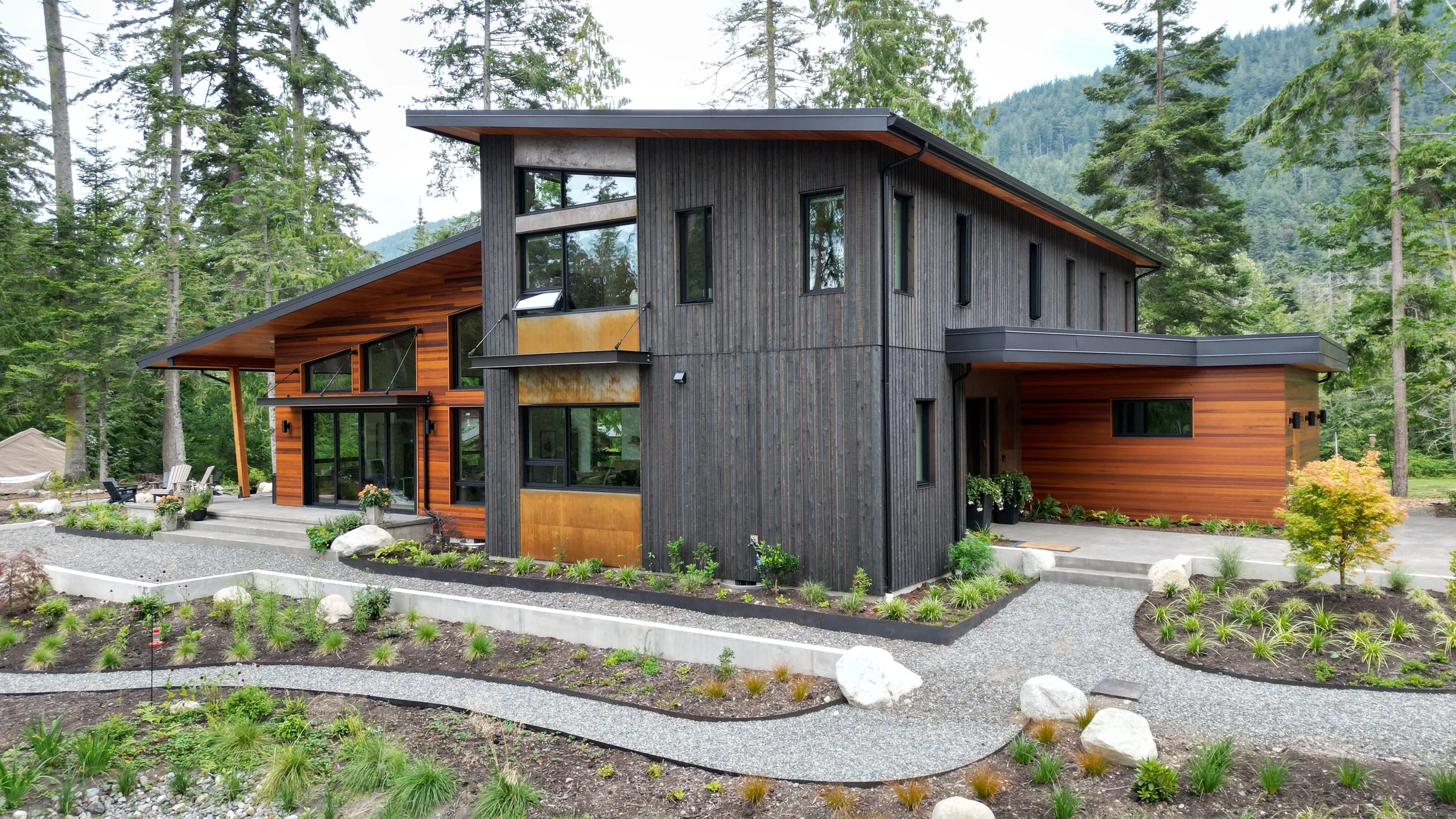 In many ways, this has been a dream project from start to finish. The homeowners approached this project with a commitment to high integrity and high quality, and gave space for the design and construction team to polish the concept into a truly special home. Built with double-stud 10” thick walls (R-38), triple-paned windows (U-0.20), a hybrid roof assembly (R-78), aggressive air-sealing and heat recovery ventilation, heat pump space conditioning, and a large solar array, this home is intended to demonstrate net-zero energy consumption; post-occupancy reviews will verify results. Tucked into the forest along the Chuckanut coastline, this home is clad largely with wood milled from trees fallen on-site. A board-formed concrete wood-burning fireplace serves as the grounding central element along the home’s entry axis, and the private primary bedroom opens onto a covered courtyard protected from the coastal weather.