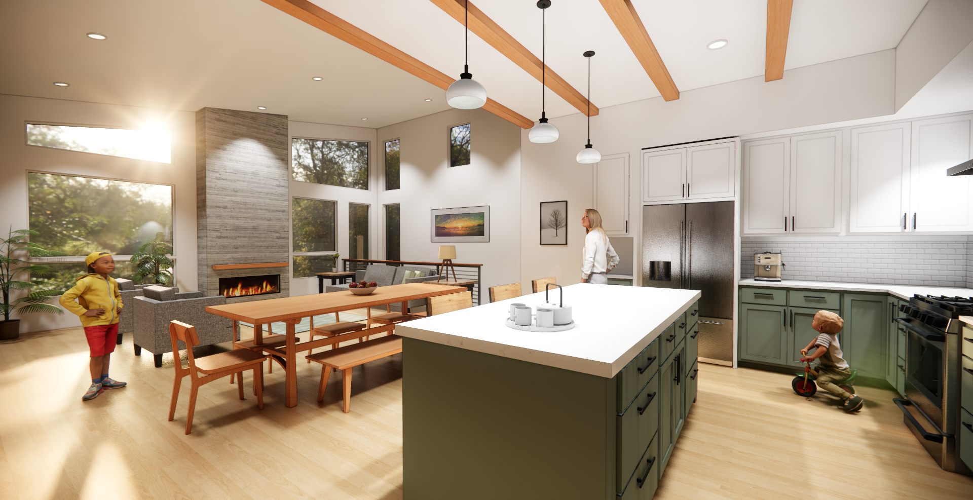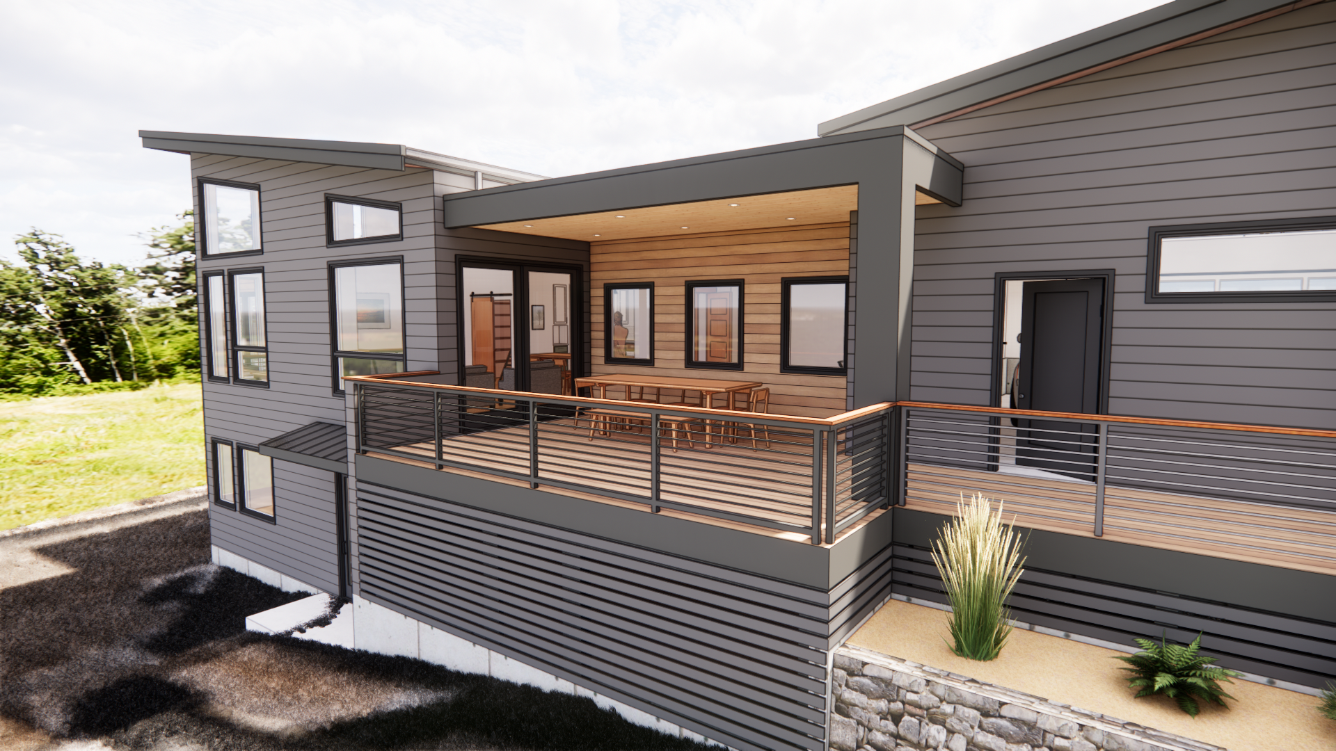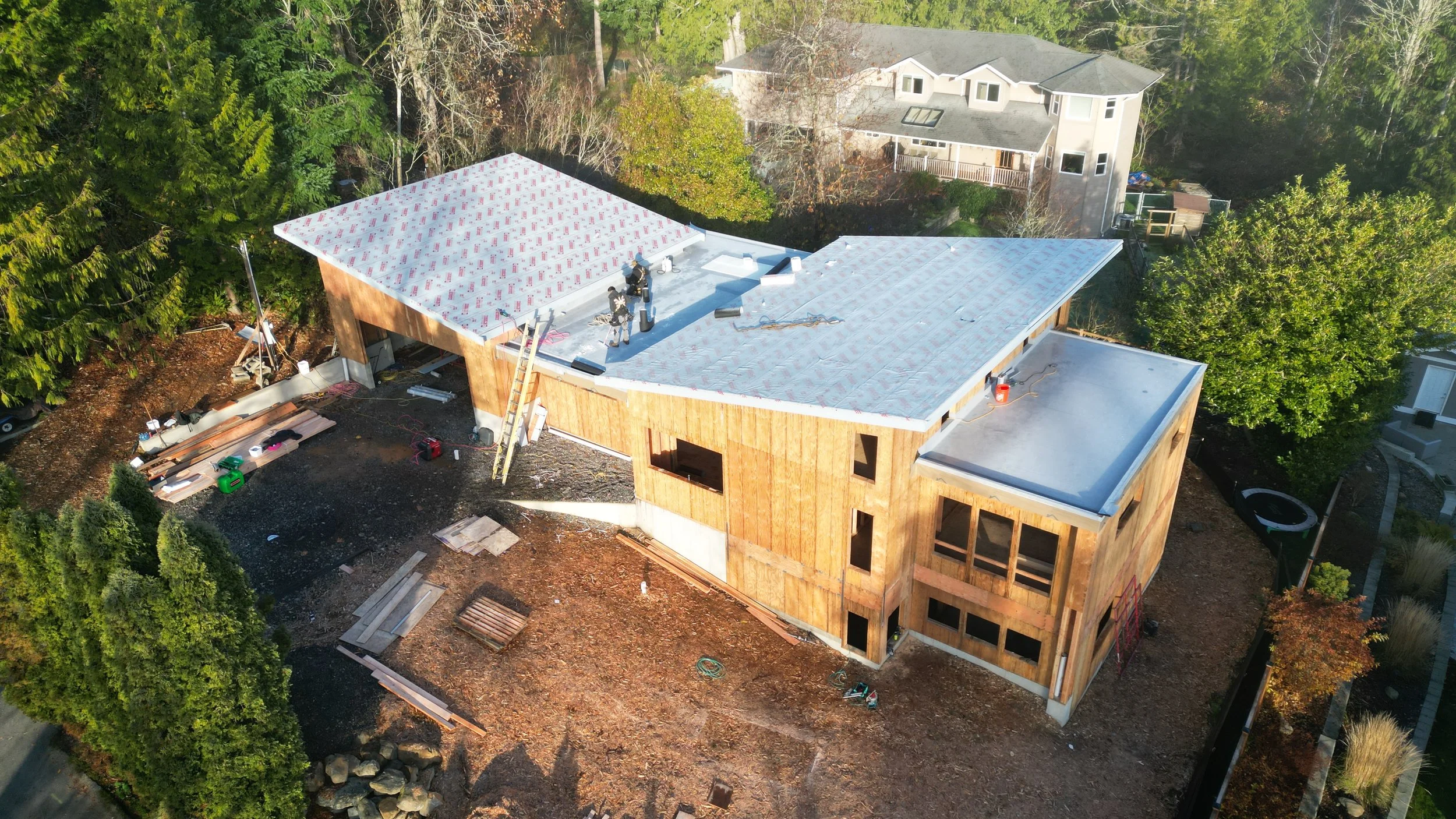 Building in the Lake Whatcom Watershed always presents a range of challenges, and this home was no exception. We responded to strict stormwater regulations by designing a roof system that allows effective collection of runoff to be gravity fed to a sand filter before exiting the property. Built on family land that connects to the grandparent’s property to the north, this project aimed to create multigenerational living environment with shared commons space between the buildings.
